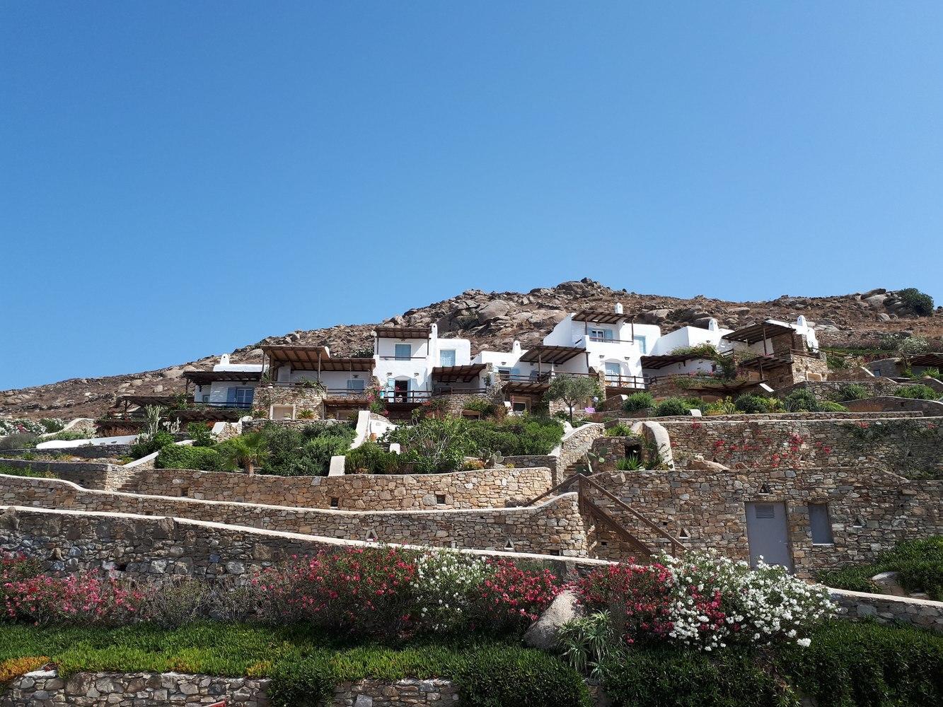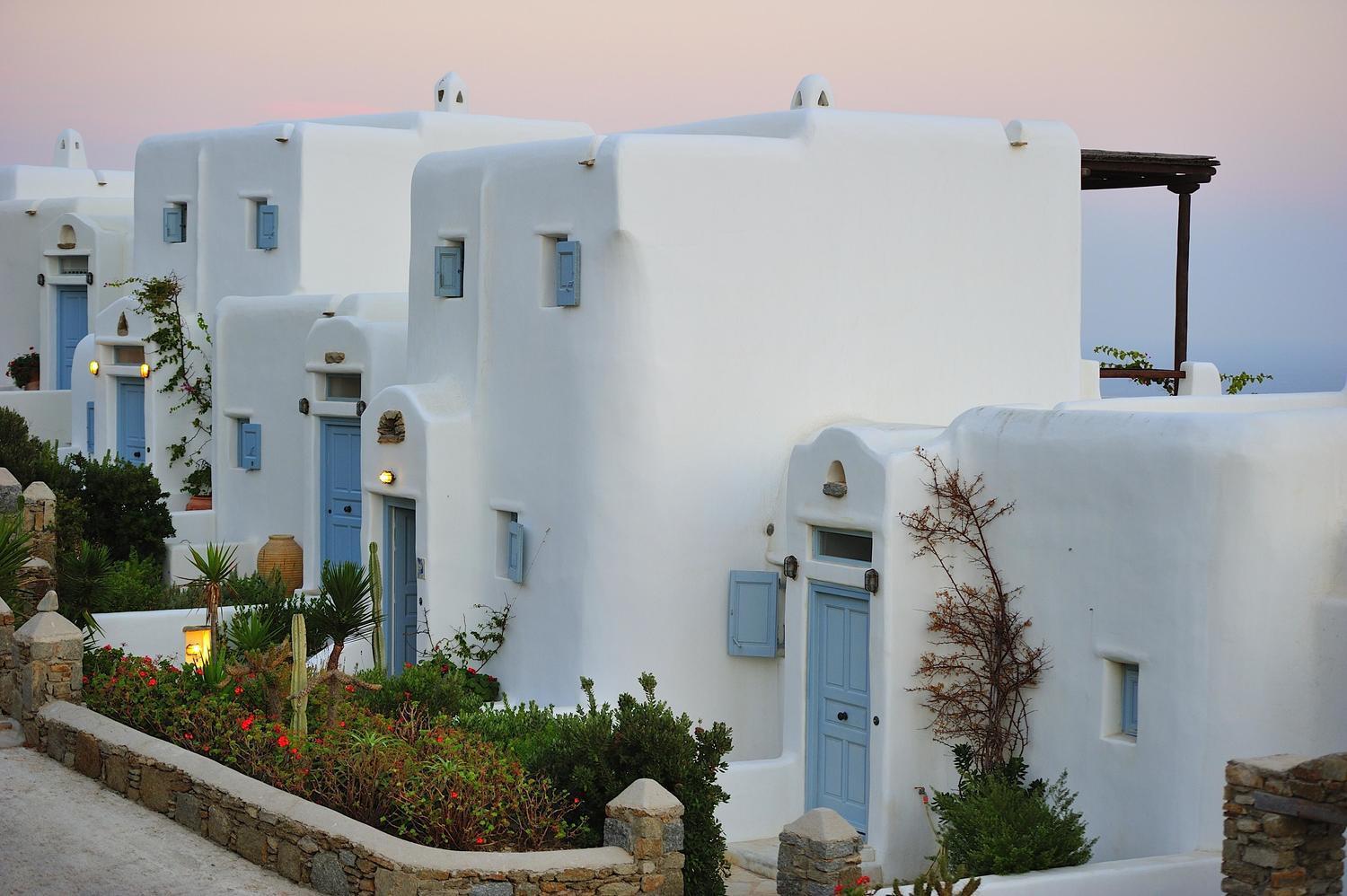 Τα κτίρια χαρακτηρίζονται από όγκους που διατάσσονται ο ένας δίπλα στον άλλο με υψομετρική διαφορά ακολουθώντας την φυσική στάθμη του εδάφους. Αυτή η διαφορά στάθμης συναντάται πολύ συχνά στις όψεις των σπιτιών κατά μήκος των δρόμων της Μυκόνου.