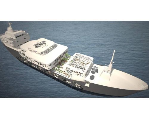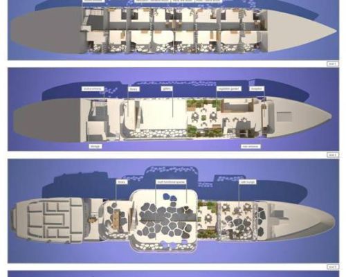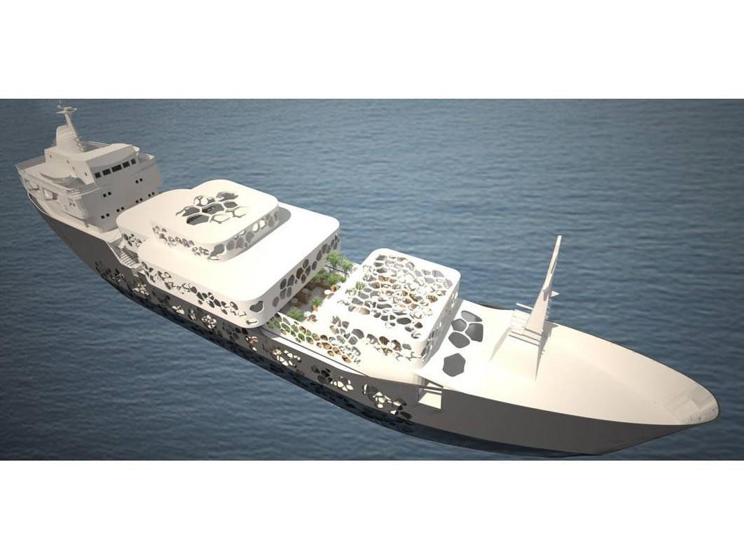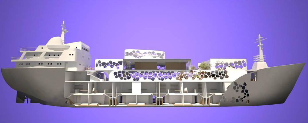 Η δομή του ξενοδοχείου παρομοιάζεται με ένα ζωντανό κοραλλιογενή οργανισμό ενσωματωμένο στο σκαρί του, μετατρέποντας το σε αγγελιαφόρο συνδέοντας τα νησιά και την ηπειρωτική χώρα μέσω του πολιτισμού και της τέχνης. Τα δύο χαμηλότερα επίπεδα του πλοίου φιλοξενούν 15 καλλιτεχνικά στούντιο σχεδιασμένα έτσι ώστε ανά δύο στούντιο να υπάρχει η δυνατότητα ένωσης με σκοπό τη συνεργασία.