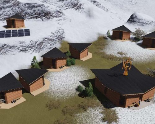 Φωτοβολταϊκά και μία μεγάλη ανεμογεννήτρια έχουν εγκατασταθεί για την παραγωγή ηλεκτρικού και θέρμανσης για τους χώρους, ενώ η συλλογή χιονόνερου επιτρέπει  να παρέχεται  πόσιμο και γενικής χρήσης νερό σε κάθε μόντουλο.