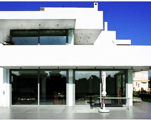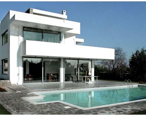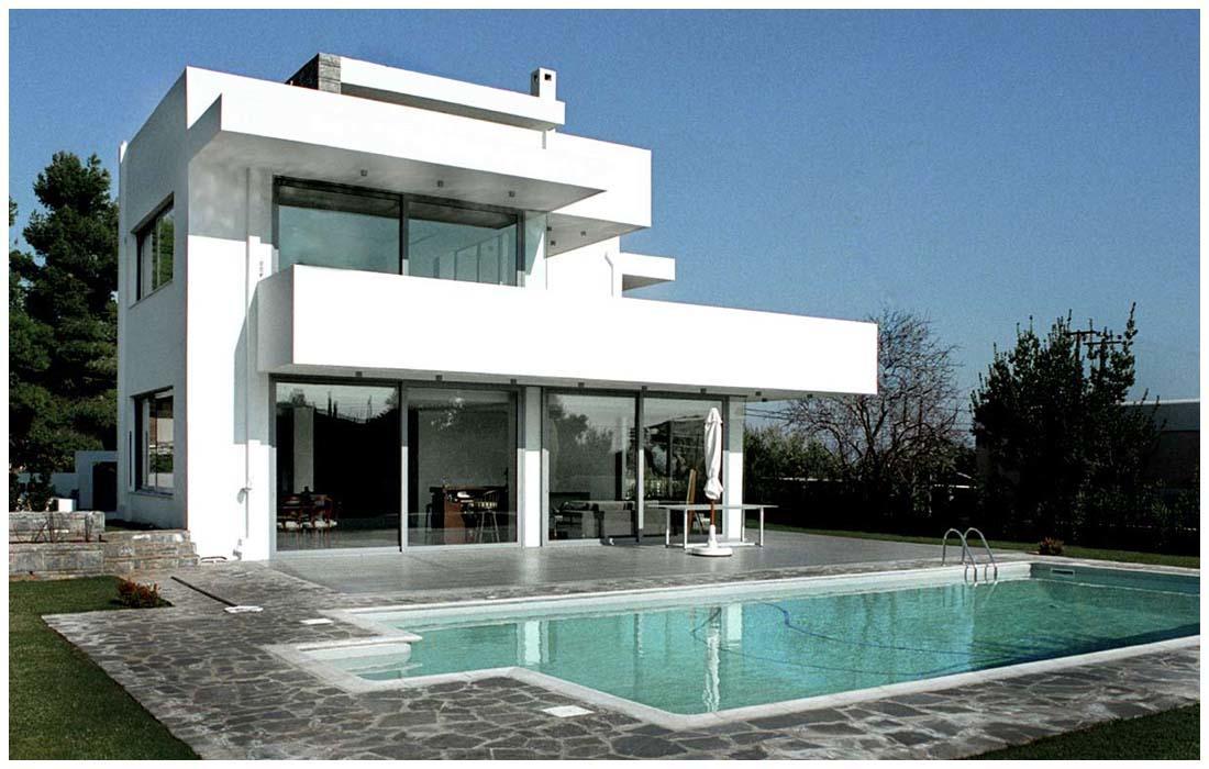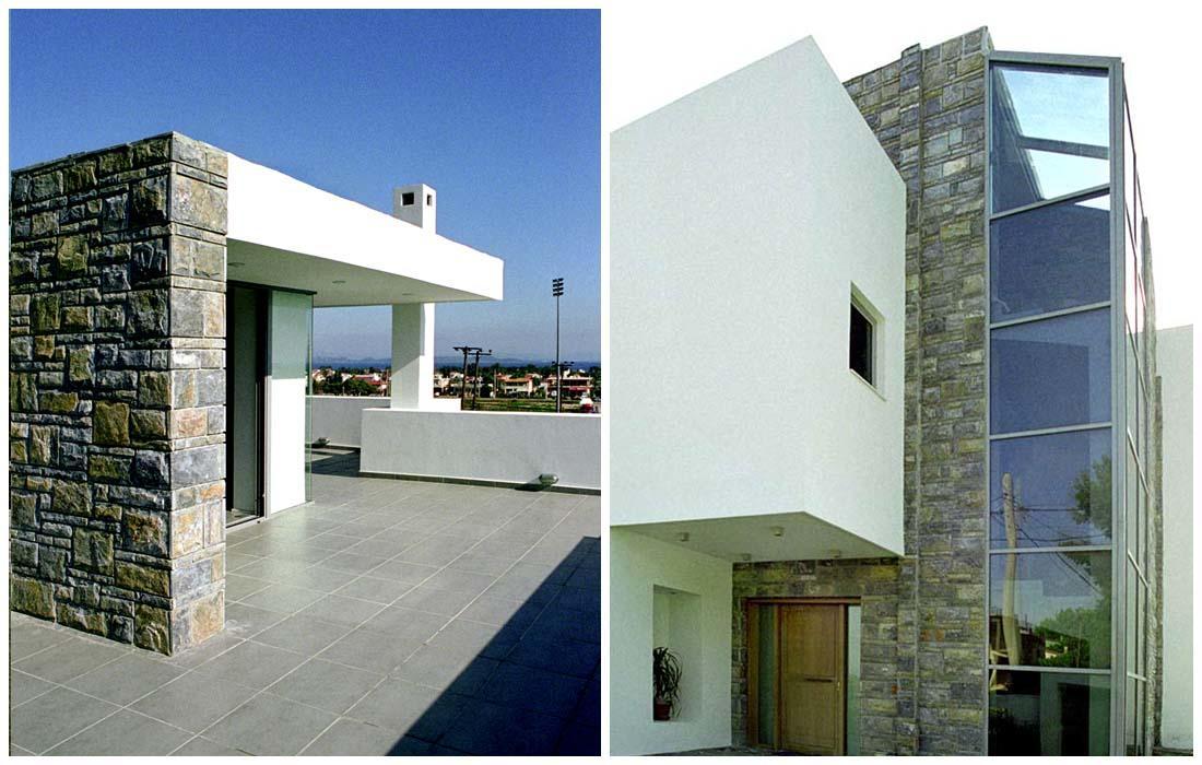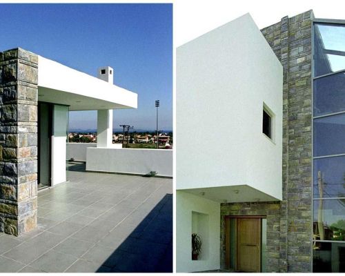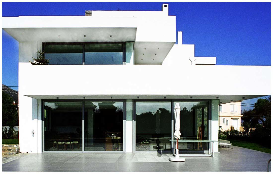 Μεγάλες κυβοειδείς μορφές εμφανίζονται στην όψη της κυρίας εισόδου, ενώ προς την πισίνα έχουν σχεδιαστεί οριζόντια επίπεδα, ακολουθώντας τις γραμμές της, δημιουργώντας μπαλκόνια.