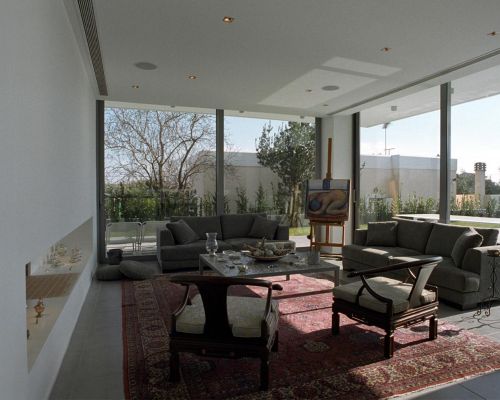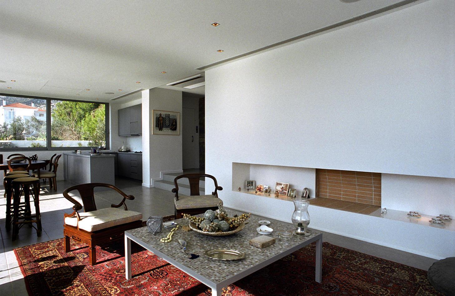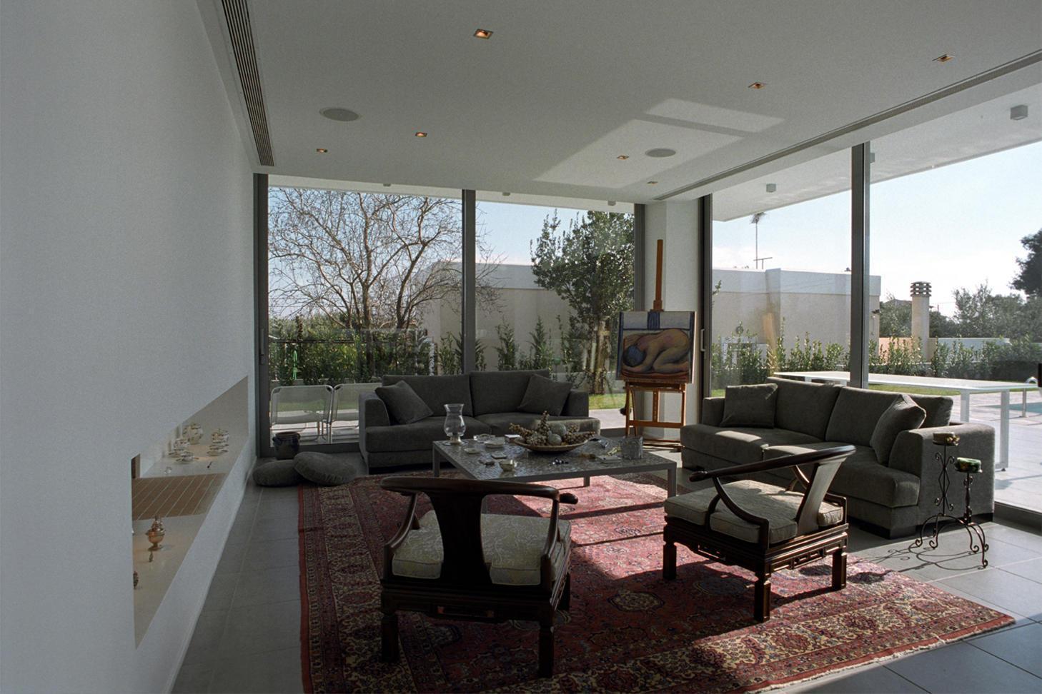 Ένας κεντρικός άξονας εσωτερικά της κατοικίας συνδέει την είσοδο με τον κήπο και την πισίνα. Το σπίτι αποτελείται από ισόγειο, όροφο και δώμα.